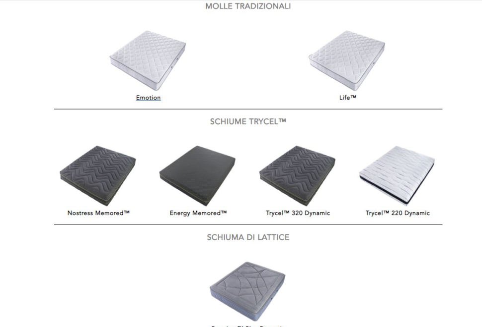 Per ognuna di esse sono proposte quattro diverse tipologie di materasso, con portanze e zone di sostegno specifiche per ognuno di essi