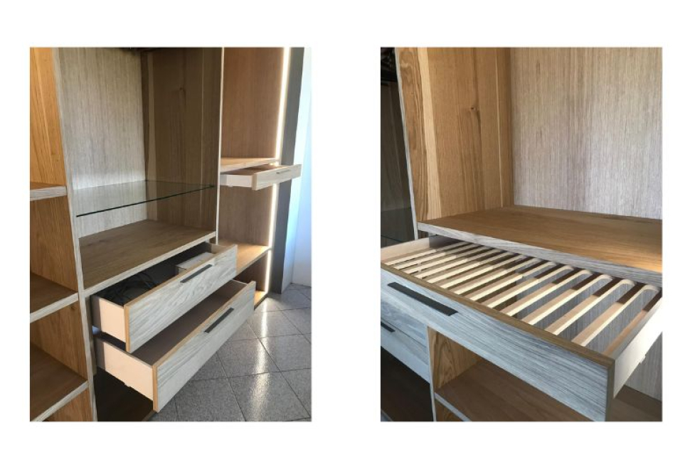 La cabina armadio LaFalegnami rappresenta l'essenza dell'eleganza e della funzionalità, grazie alla sua struttura in tamburato con finitura in rovere naturale. Questo materiale non solo conferisce un aspetto raffinato, ma garantisce anche una robustezza e una leggerezza senza pari. La tecnologia costruttiva del tamburato, con il suo telaio perimetrale in massello di legno e i pannelli in MDF impiallacciati, assicura un ambiente salubre riducendo al minimo il rilascio di VOC.