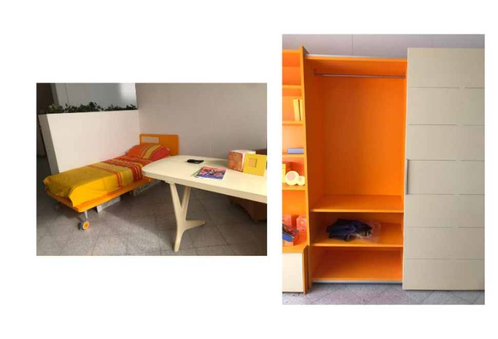 Uno degli aspetti più interessanti di questa cameretta è la sua versatilità. Gli elementi possono essere disposti liberamente secondo le esigenze dello spazio disponibile, con l'unica eccezione della base a terra ad L. Questo permette di personalizzare l'ambiente in modo unico e funzionale. La scrivania a gamba singola può essere fissata al muro in qualsiasi punto della stanza, offrendo ulteriore libertà di configurazione.