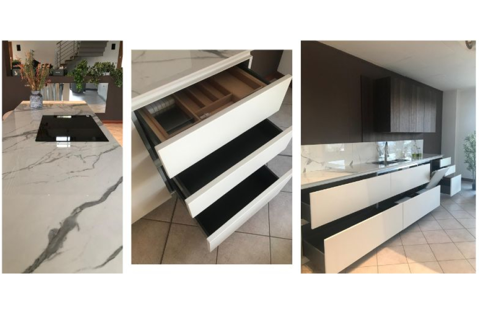 Questa cucina si integra perfettamente negli spazi open space, dove estetica e funzionalità si fondono armoniosamente. Approfitta dell'offerta speciale per rinnovo expo e porta a casa un pezzo unico che valorizzerà ogni momento passato in cucina.